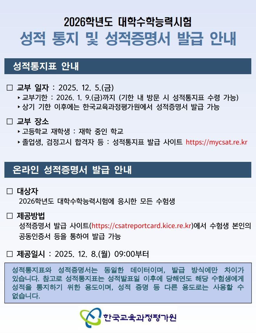 ◦ Á¹¾÷»ý ¹× °ËÁ¤°í½Ã ÇÕ°ÝÀÚ ¼öÇè»ý Áß ¼ö´É ÀÀ½Ã ¼öÇè»ýÀº 2026Çг⵵ ´ëÇмöÇÐ ´É·Â½ÃÇèÀÇ ¼ºÀûÅëÁö´Â º»ÀÎÀÎÁõÀ» ÅëÇÑ ¿Â¶óÀÎ Á¶È¸ ¹× Ãâ·Â¸¸ °¡´É