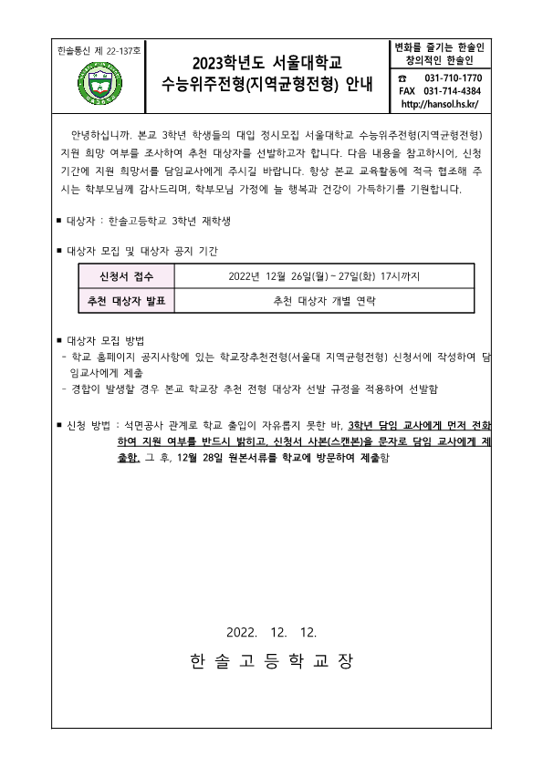°¡Á¤Åë½Å¹® Home > ¾Ë¸²¸¶´ç > °¡Á¤Åë½Å¹® ÀÌ ÆäÀÌÁö´Â ÀÚ¹Ù½ºÅ©¸³Æ®°¡ Áö¿øµÇÁö ¾Ê´Â ºê¶ó¿ìÀú¿¡¼ ÀϺΠ±â´ÉÀÌ Á¦´ë·Î ÀÛµ¿ÇÏÁö ¾Ê½À´Ï´Ù. Á¦¸ñ 2023Çг⵵ ¼¿ï´ëÇб³ ¼ö´ÉÀ§ÁÖÀüÇü(Áö¿ª±ÕÇüÀüÇü) ¾È³» À̸§ ÃÖ*¿Á µî·ÏÀÏ 2022-12-12 ÷ºÎÆÄÀÏ Àüü ÆÄÀÏ ´Ù¿î·Îµå ºê¶ó¿ìÀú º¸¾È ¾÷µ¥ÀÌÆ®·Î ÀÎÇÑ ´Ù¿î·Îµå ºÒ°¡ ½Ã, ´Ù¿î·Îµå ¾È³» ¿§Áö : edge://settings/content/insecureContent [Ŭ¸¯ ÈÄ ÁÖ¼Òâ¿¡ ºÙ¿©³Ö±â] Å©·Ò : chrome://settings/content/insecureContent [Ŭ¸¯ ÈÄ ÁÖ¼Òâ¿¡ ºÙ¿©³Ö±â] À§ ÁÖ¼Ò·Î Á¢±ÙÇϼż Çã¿ë ºÎºÐ¿¡ Çб³ µµ¸ÞÀÎ()À» ³Ö°í ÀúÀåÇÏ½Ã¸é ´Ù¿î·Îµå°¡ °¡´ÉÇØÁý´Ï´Ù. ÀμâÇϱ⠸ñ·Ï ÀÌÀü±Û 2022Çг⵵ 3Çгâ Á¹¾÷½Ä ¾È³» / ÃÖ¿µ¿Á 2022.12.12 ´ÙÀ½±Û µî±³ ½Ã°£ Á¶Á¤ ÀÇ°ß ¼ö·Å °á°ú ¾È³» / ÃÖ¿µ¿Á 2022.12.13