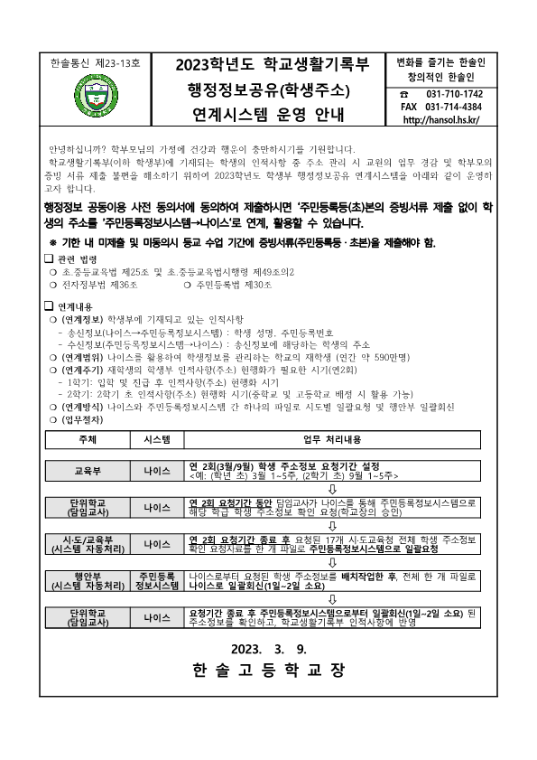°¡Á¤Åë½Å¹® Home > ¾Ë¸²¸¶´ç > °¡Á¤Åë½Å¹® ÀÌ ÆäÀÌÁö´Â ÀÚ¹Ù½ºÅ©¸³Æ®°¡ Áö¿øµÇÁö ¾Ê´Â ºê¶ó¿ìÀú¿¡¼ ÀϺΠ±â´ÉÀÌ Á¦´ë·Î ÀÛµ¿ÇÏÁö ¾Ê½À´Ï´Ù. Á¦¸ñ 2023Çг⵵ Çб³»ýȰ±â·ÏºÎ ÇàÁ¤Á¤º¸°øÀ¯(ÇлýÁÖ¼Ò) ¿¬°è½Ã½ºÅÛ ¿î¿µ ¾È³» À̸§ ÃÖ*¿Á µî·ÏÀÏ 2023-03-09 ÷ºÎÆÄÀÏ 2023Çг⵵ Çб³»ýȰ±â·ÏºÎ ÇàÁ¤Á¤º¸°øÀ¯(ÇлýÁÖ¼Ò)¾È³» °¡Á¤Åë½Å¹®.hwp   ´Ù¿î·Îµå ¼ö : [ 11 ] Àüü ÆÄÀÏ ´Ù¿î·Îµå ºê¶ó¿ìÀú º¸¾È ¾÷µ¥ÀÌÆ®·Î ÀÎÇÑ ´Ù¿î·Îµå ºÒ°¡ ½Ã, ´Ù¿î·Îµå ¾È³» ¿§Áö : edge://settings/content/insecureContent [Ŭ¸¯ ÈÄ ÁÖ¼Òâ¿¡ ºÙ¿©³Ö±â] Å©·Ò : chrome://settings/content/insecureContent [Ŭ¸¯ ÈÄ ÁÖ¼Òâ¿¡ ºÙ¿©³Ö±â] À§ ÁÖ¼Ò·Î Á¢±ÙÇϼż Çã¿ë ºÎºÐ¿¡ Çб³ µµ¸ÞÀÎ()À» ³Ö°í ÀúÀåÇÏ½Ã¸é ´Ù¿î·Îµå°¡ °¡´ÉÇØÁý´Ï´Ù. ÀμâÇϱ⠸ñ·Ï ÀÌÀü±Û 2023 ÇкθðÃÑȸ ¿î¿µ ¾È³» / ÃÖ¿µ¿Á 2023.03.09 ´ÙÀ½±Û ¾ÈÀü°øÁ¦È¸ °øÁ¦Á¦µµ ¹× ½ÅûÀýÂ÷ ¾È³» / ÃÖ¿µ¿Á 2023.03.10