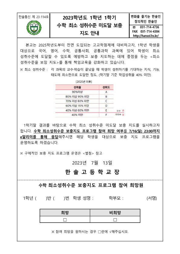 °¡Á¤Åë½Å¹® Home > ¾Ë¸²¸¶´ç > °¡Á¤Åë½Å¹® ÀÌ ÆäÀÌÁö´Â ÀÚ¹Ù½ºÅ©¸³Æ®°¡ Áö¿øµÇÁö ¾Ê´Â ºê¶ó¿ìÀú¿¡¼ ÀϺΠ±â´ÉÀÌ Á¦´ë·Î ÀÛµ¿ÇÏÁö ¾Ê½À´Ï´Ù. Á¦¸ñ 2023Çг⵵ 1Çгâ 1Çб⠼öÇÐ ÃÖ¼Ò ¼ºÃë¼öÁØ ¹Ìµµ´Þ º¸Ãæ Áöµµ ¾È³» À̸§ ÃÖ*¿Á µî·ÏÀÏ 2023-07-13 ÷ºÎÆÄÀÏ ¼öÇÐ ÃÖ¼Ò¼ºÃë¼öÁØ º¸ÃæÁöµµ ÇÁ·Î±×·¥ ¾È³» °¡Á¤Åë½Å¹®.hwp   ´Ù¿î·Îµå ¼ö : [ 8 ] Àüü ÆÄÀÏ ´Ù¿î·Îµå ºê¶ó¿ìÀú º¸¾È ¾÷µ¥ÀÌÆ®·Î ÀÎÇÑ ´Ù¿î·Îµå ºÒ°¡ ½Ã, ´Ù¿î·Îµå ¾È³» ¿§Áö : edge://settings/content/insecureContent [Ŭ¸¯ ÈÄ ÁÖ¼Òâ¿¡ ºÙ¿©³Ö±â] Å©·Ò : chrome://settings/content/insecureContent [Ŭ¸¯ ÈÄ ÁÖ¼Òâ¿¡ ºÙ¿©³Ö±â] À§ ÁÖ¼Ò·Î Á¢±ÙÇϼż Çã¿ë ºÎºÐ¿¡ Çб³ µµ¸ÞÀÎ()À» ³Ö°í ÀúÀåÇÏ½Ã¸é ´Ù¿î·Îµå°¡ °¡´ÉÇØÁý´Ï´Ù. ÀμâÇϱ⠸ñ·Ï ÀÌÀü±Û 2023Çг⵵ 1Çгâ 1Çб⠱¹¾î ÃÖ¼Ò ¼ºÃë¼öÁØ ¹Ìµµ´Þ º¸Ãæ Áöµµ ¾È³» / ÃÖ¿µ¿Á 2023.07.13 ´ÙÀ½±Û 2023Çг⵵ 1Çгâ 1Çб⠿µ¾î ÃÖ¼Ò ¼ºÃë¼öÁØ ¹Ìµµ´Þ º¸Ãæ Áöµµ ¾È³» / ÃÖ¿µ¿Á 2023.07.13