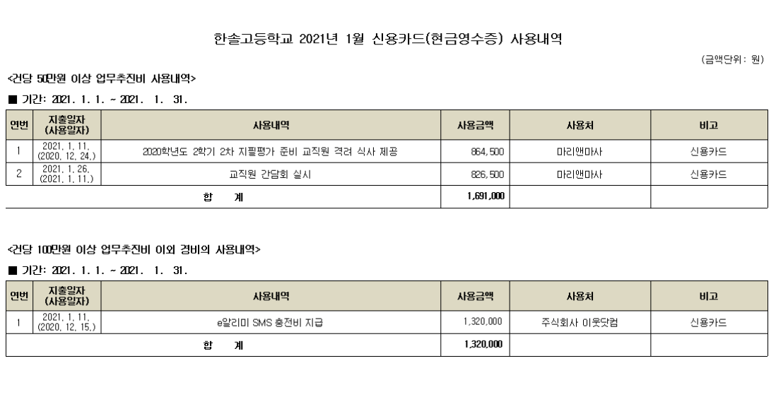 - °ø°³³»¿ª: 2021³â 1¿ù °Ç´ç 50¸¸¿ø ÀÌ»ó ¾÷¹«ÃßÁøºñ ¹× °Ç´ç 100¸¸¿ø ÀÌ»ó ¾÷¹«ÃßÁøºñ ÀÌ¿Ü °æºñ ½Å¿ëÄ«µå(Çö±Ý¿µ¼öÁõ) »ç¿ë³»¿ª